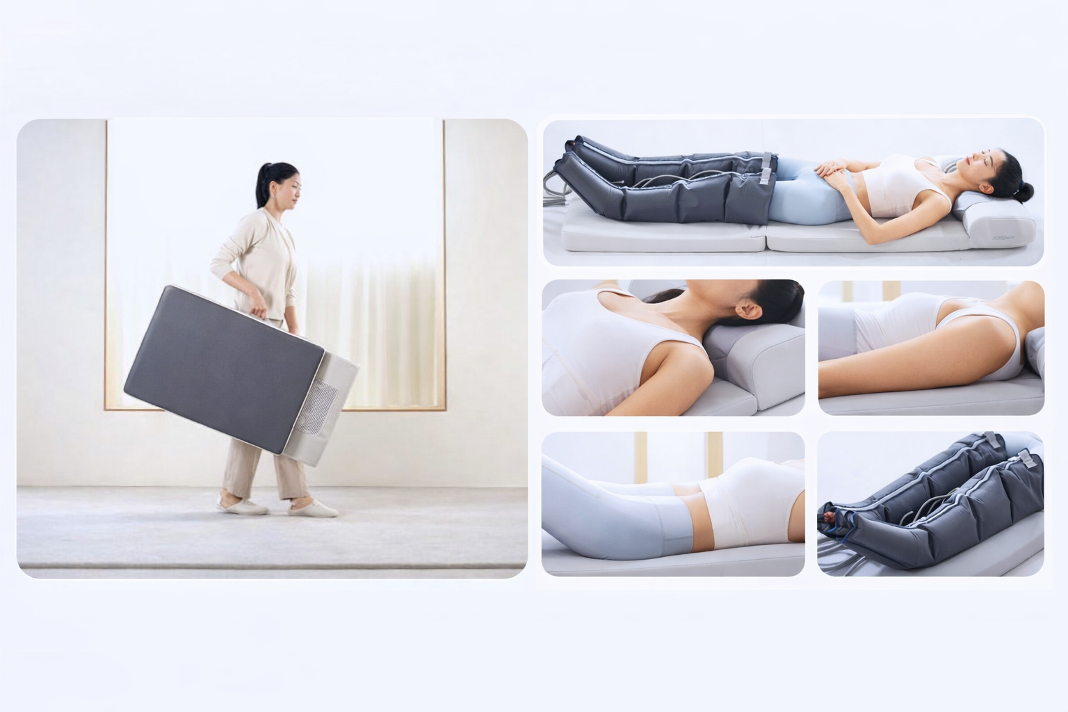- Băng quấn massage chân (02 chiếc): Sử dụng khí nén để tác động lên vùng chân, giúp tăng cảm giác thư giãn và hỗ trợ lưu thông hiệu quả.