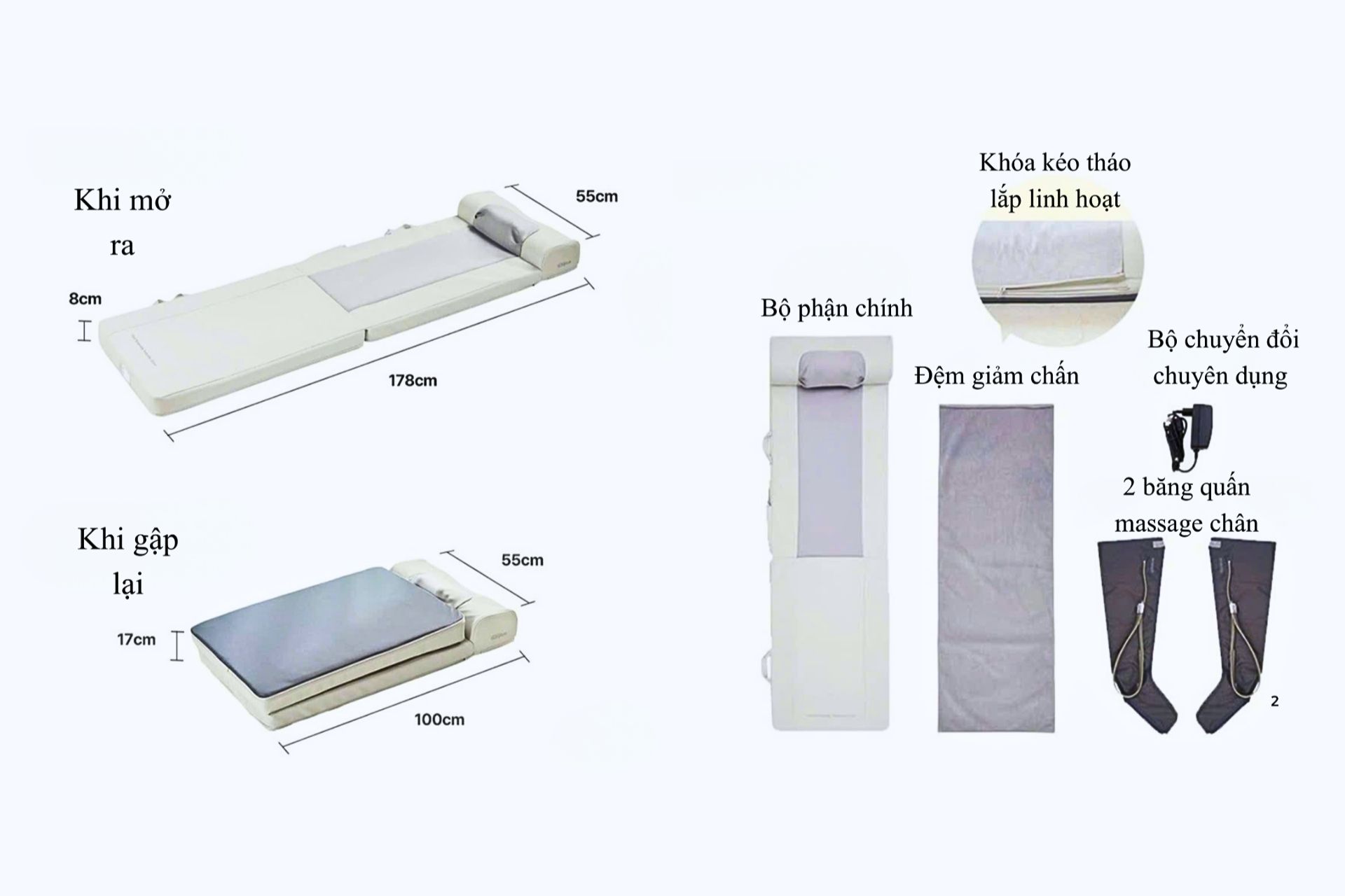 - Kích thước khi mở: 178 × 55 × 8 cm, phù hợp với nhiều vóc dáng người dùng